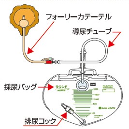 尿を排出することは、人間にとって大切な生理機能です。老廃物を尿として出すだけではなく、体の水分バランスを 調整するという重要な役割があります。 病気や手術によって一時的にでも尿を体から出せない場合、専用のチューブを通じて外に排出しなければなりません。 排出した尿の成分を検査することで体の状態を知ることもできます。 「導尿カテーテル」とは尿道といわれる膀胱からの管に挿入して、膀胱にたまった尿を排出させるためのチューブのことです。挿入したチューブを小さな風船によって膀胱に固定できる構造のチューブを一般的に「フォーリーカテーテル」と呼んでいます。導尿カテーテルにより排出された尿をためる専用のバッグを「採尿バッグ」と呼びます。(図1) 「フォーリーカテーテル」は、膀胱に溜まった尿を、対外へ排出するために使用する医療機器です。(図2)